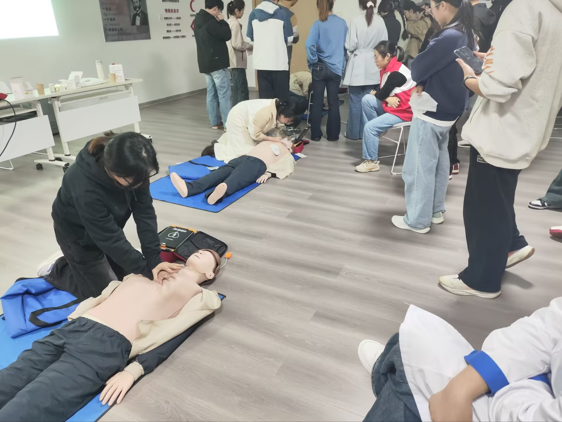 培训内容紧密贴合校园生活实际需求,重点围绕心肺复苏(CPR)、自动体外除颤器(AED)使用两大核心急救技能展开。活动创新采用“线上理论预习+线下实操演练+分组互动练习”的多元化模式,确保培训效果直达人心。实操培训前,公司通过线上学习平台推送应急救护理论课件、教学视频等资料,让同学们提前熟悉急救原则、操作流程及注意事项,为线下实操打下扎实基础。