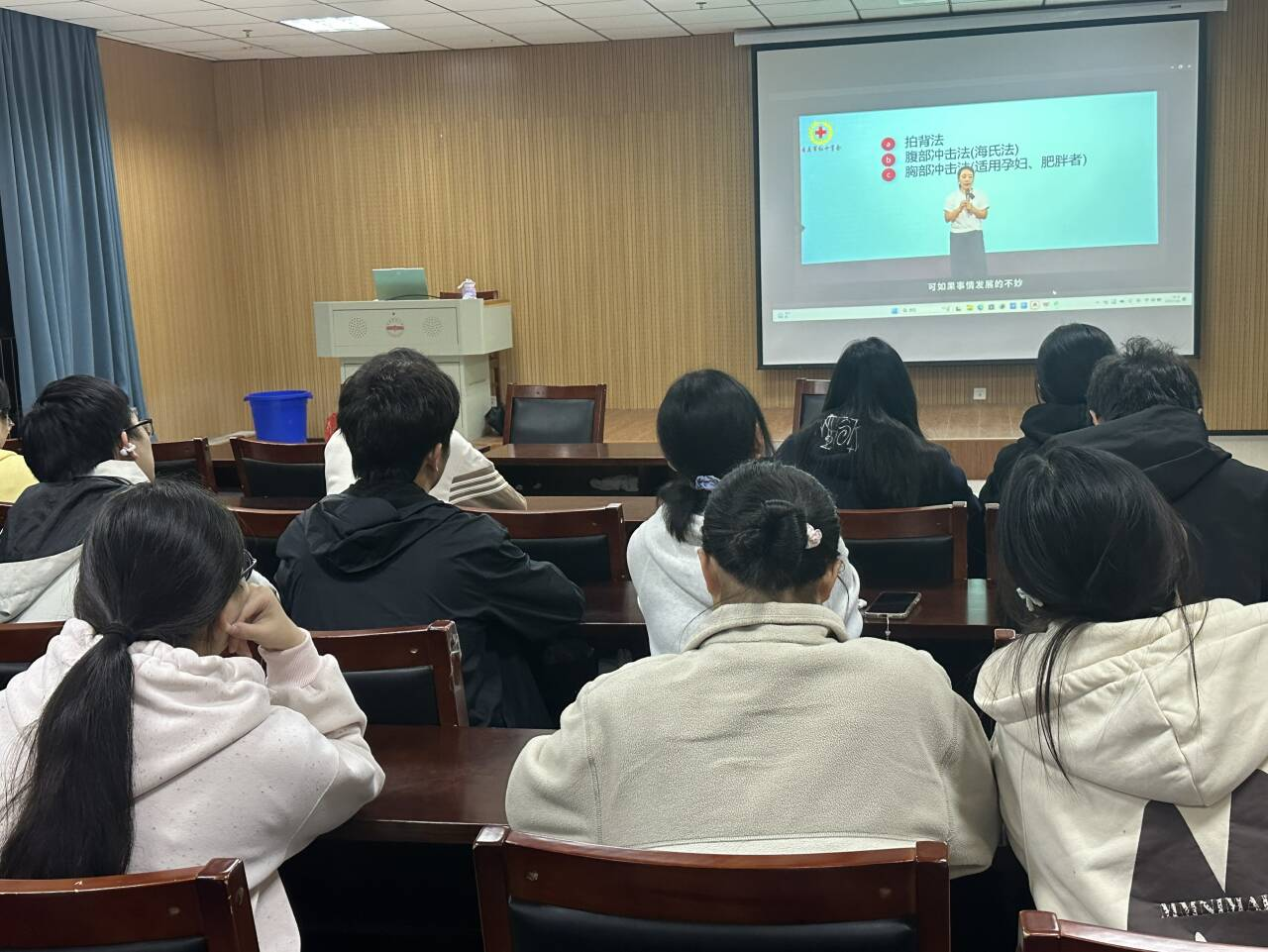 线下培训现场,校医院的专业救护师团队凭借丰富的临床经验和教学经验,为同学们带来了生动详实的讲解与演示。救护师们从应急救护的基本原则入手,着重强调了心跳呼吸骤停后的“黄金4分钟”救援时间的重要性,让同学们深刻认识到及时有效的急救对挽救生命的关键作用。在心肺复苏实操演示环节,救护师细致拆解了判断意识、呼救、胸外按压、开放气道、人工呼吸等每一个步骤,对按压深度、频率、呼吸节奏等技术要点反复强调、亲自示范。在AED使用教学中,救护师详细讲解了设备启动、电极片粘贴、故障处理等关键操作,消除了同学们对专业设备的陌生感和畏惧心理。