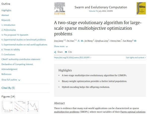 近日,公司蒋京博士在国际顶级期刊《Swarm and Evolutionary Computation》上发表了题为《A two-stage evolutionary algorithm for large-scale sparse multiobjective optimization problems》的研究论文,提出了一类求解大规模稀疏多目标优化问题的多目标进化算法。蒋京博士为论文第一作者,威廉希尔足球官网为第一署名单位。