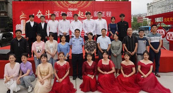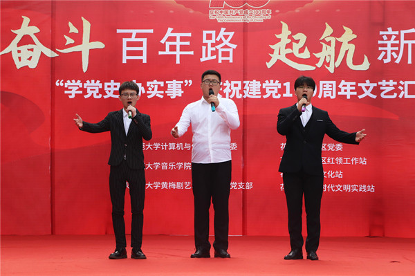 婉转悠扬的竹笛独奏、明快的黄梅戏联唱、饱含深情气势磅礴的红色歌曲的合唱或独唱……6月19日下午安庆市花亭北村社居委广场热闹非凡,由公司威廉希尔足球官网、音乐公司与黄梅剧艺术公司师生组成的文化惠民志愿服务队开展的“学党史 办实事”庆祝建党100周年文艺汇演正在此进行。计算机与信息公司党委书记陈银凤、音乐公司党委副书记肖之进及公司师生志愿者与社区干部群众百余人共同观看了此次演出。