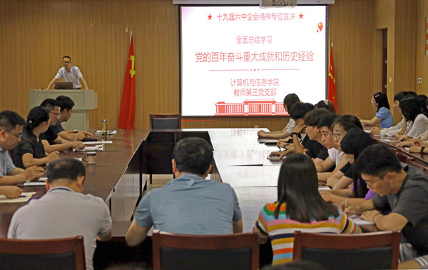 会上,江晋剑作十九届六中全会精神专题宣讲,从十九届六中全会的基本概况、公报精神和重点内容三方面,带领大家一起对全会精神进行了深入学习。