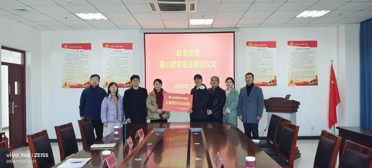 11月28日,威廉希尔足球官网举行“联丰资源爱心助学金”捐赠仪式。安庆市联丰再生资源有限公司总经理、公司创新创业校外导师章永丰等一行来校出席活动,校教育发展基金会有关同志、威廉希尔足球官网领导班子全体成员及辅导员代表等参加仪式。