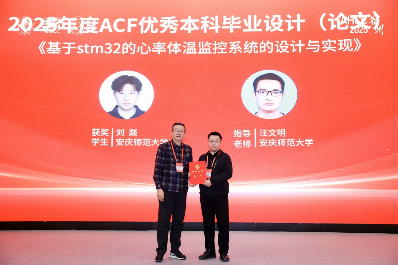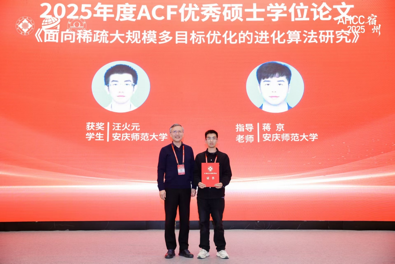 本届大会的优秀学位论文评选环节中,公司取得了喜人的成绩。蒋京副教授指导硕士生汪火元完成的《面向稀疏大规模多目标优化的进化算法研究》荣获“2025年度ACF优秀硕士学位论文”奖;汪文明副教授指导本科生刘燚完成的《基于STM32的心率体温监控系统的设计与实现》荣获“2025年度ACF优秀本科毕业设计(论文)”奖。上述荣誉充分体现了公司在教学质量提升和人才培养方面的良好成效,进一步激发了师生在科研创新与实践探索中的积极性与创造力。