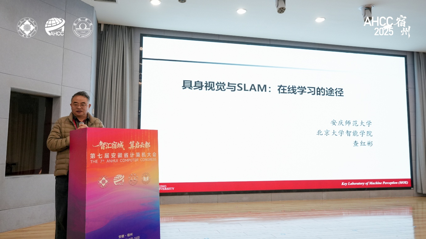 大会邀请公司查红彬教授作主旨报告。查红彬教授以《具身视觉与SLAM:在线学习的途径》为题,系统介绍在线学习在动态SLAM、自适应VIO、三维重建与隐式地图建模中的关键作用,展示团队在复杂环境智能感知能力提升方面的最新研究成果,为具身智能在真实场景落地提供了重要启发。