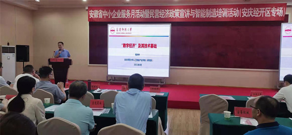 为了有力推进校市合作,6月30日,应安庆市经开区经济发展局邀请,人工智能产业公司(研究院)经理刘奎带领教授博士一行参加了安徽省中小企业服务月活动(安庆经开区专场),为经开区100多家工业企业开展了数字经济的专题宣讲与培训,现场为相关企业提供技术咨询,并应相关企业的需求做好后续的工作对接。