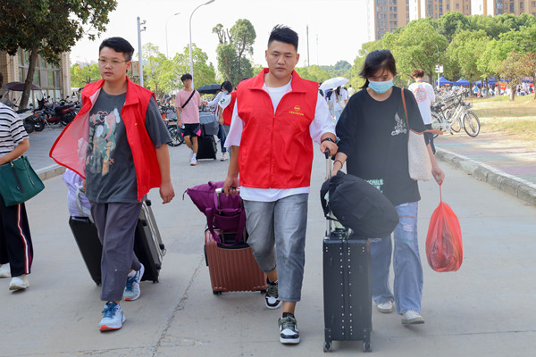 炽热的太阳,身穿红色马甲的志愿者将大包小件的厚重行李搬至宿舍,乔添歌与吴自强是其中两人,他们均来自计算机科学与技术专业2021(2)班。一上午的时间,他们在西门与16号宿舍5楼之间来回折返了八趟,持续的“体力活”已让他们汗流浃背,但仍然在不停地奔走忙碌。“尽管感到很疲惫,但能在迎新工作中奉献自己的一份力量,我感觉累并快乐着。”